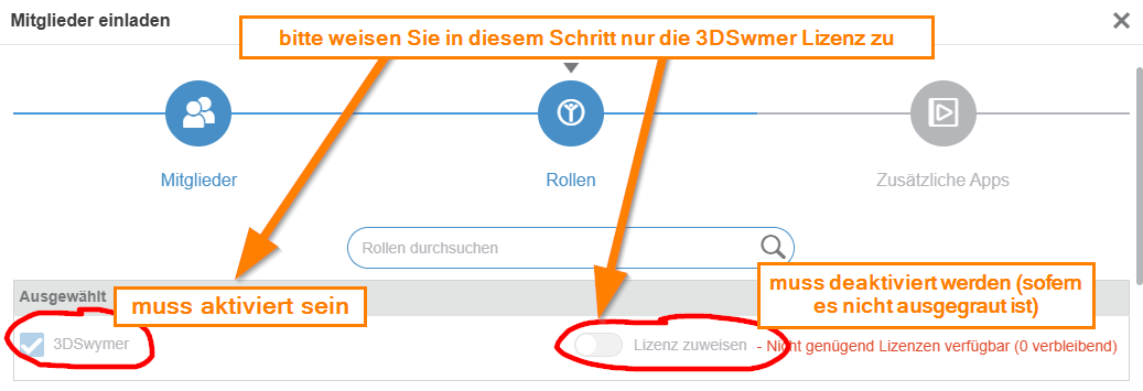 In the next step go sure that the "3DSwymer" License is activated but NOT assigned.